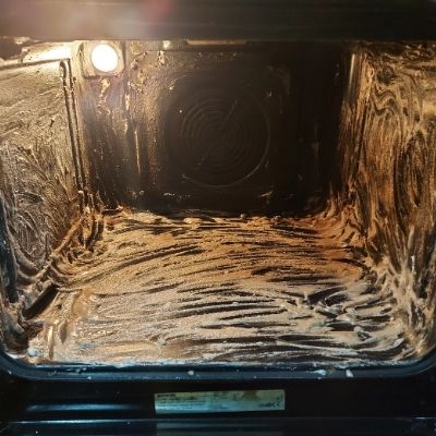 Pasto iz sode bikarbone nanesete po notranjih površinah pečice, pri tem pa se izognite grelnim elementom, odprtine v pečici pa zaščitite s folijo.