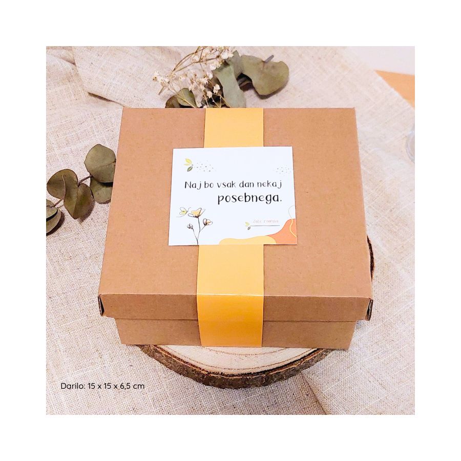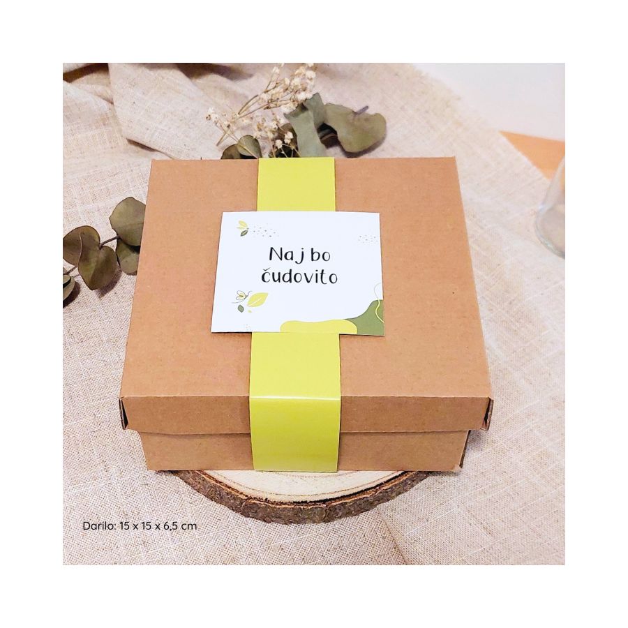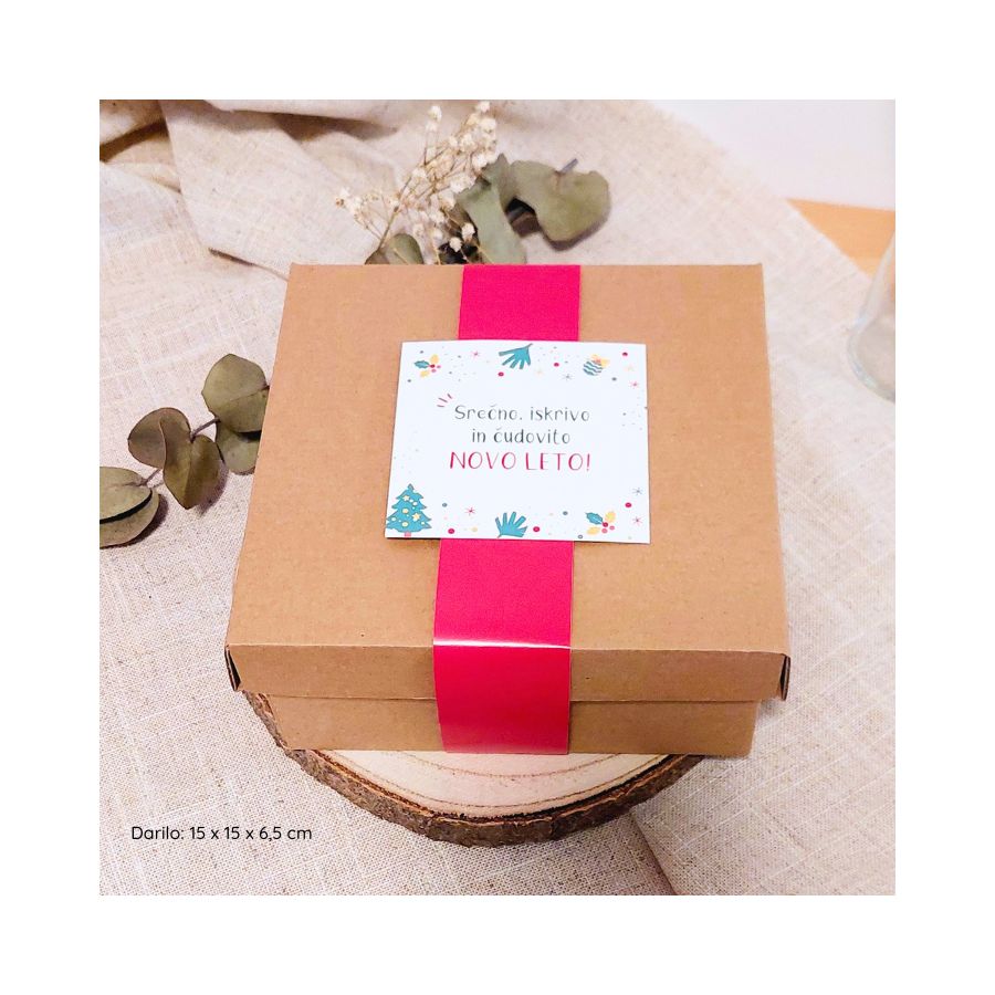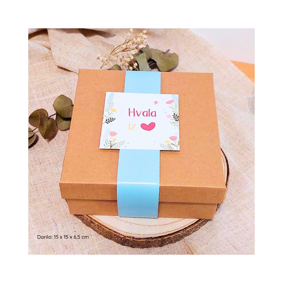 Darilo Mia je pakirano v lični darilni embalaži velikosti 9 x 9 x 5 cm s posvetilom.
