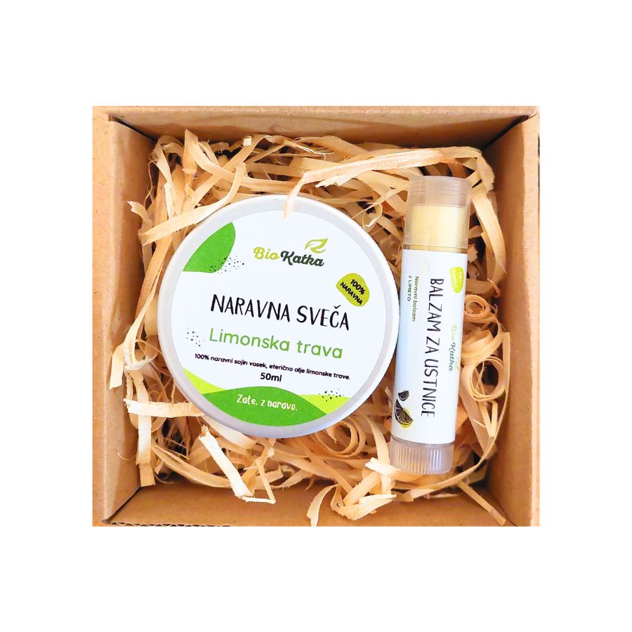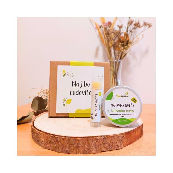 Darilo Mia sestavljata balzam za ustnice v stiku in dišeča svečka limonska trava BioKatka.