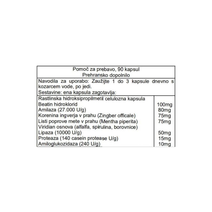 Pomoč za prebavo – prebavni encimi – veganska kombinacija encimov, betain hidroklorida, poprove mete in ingverja pomaga spodbujati zdravo in uravnoteženo okolje za prebavo z optimalno učinkovitostjo.