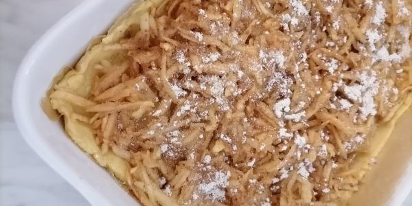 - Po testu v pekaču razporedimo naribana jabolka, sladkor, vanilijev sladkor in cimet.